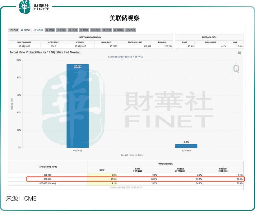 这引发了华尔街对于美联储加快降息步伐的憧憬,见下图,利率期货工具显示,对于9月份美联储降息25个基点的预期已从一周前的63.1%大幅飙升至95.9%。