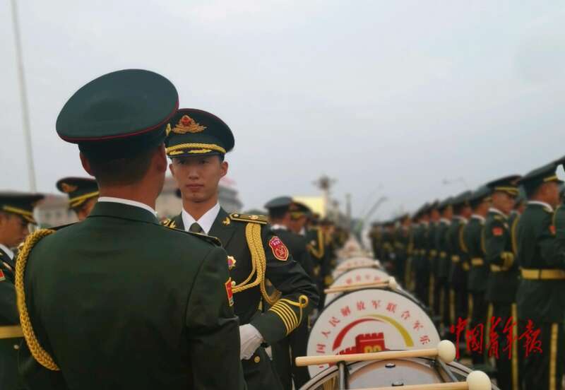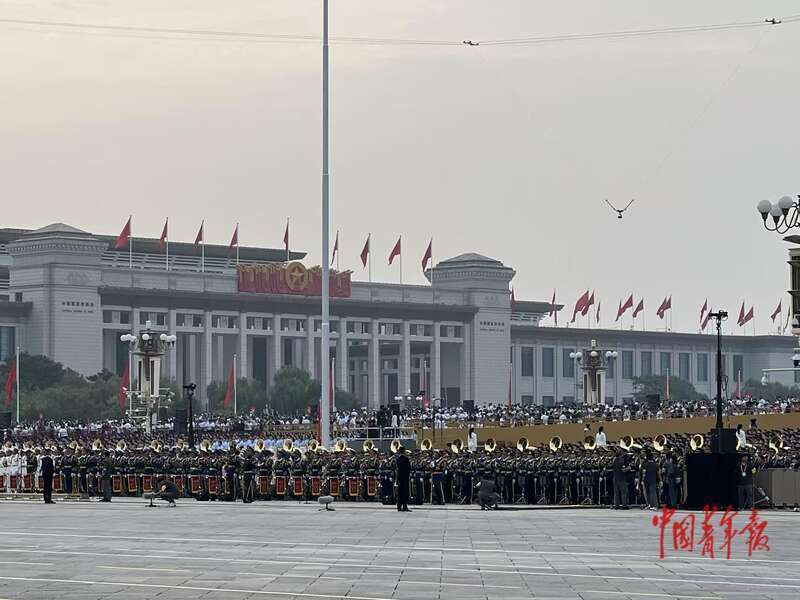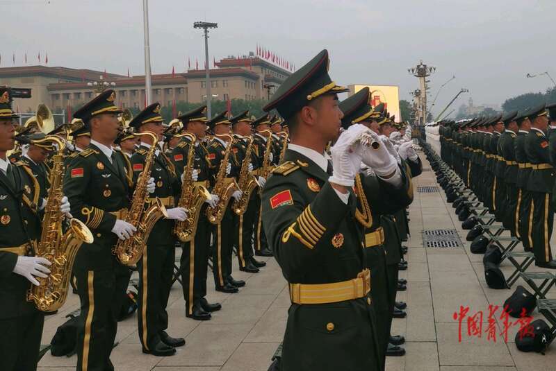 9月3日早晨,北京,中国人民解放军联合军乐团在天安门广场排练。当天,纪念中国人民抗日战争暨世界反法西斯战争胜利80周年大会将在北京隆重举行。中青报·中青网记者 张国/摄